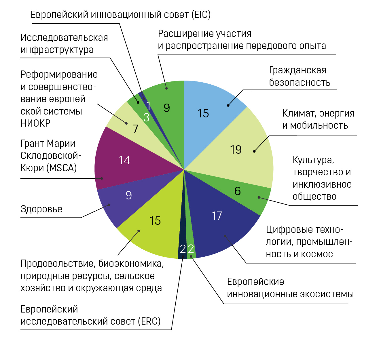 Кипрские организации регулярно участвуют в финансовых программах исследований и инноваций (R&K) Европейского союза. Вот как распределялись по тематикам исследований полученные гранты Horizon Europe.