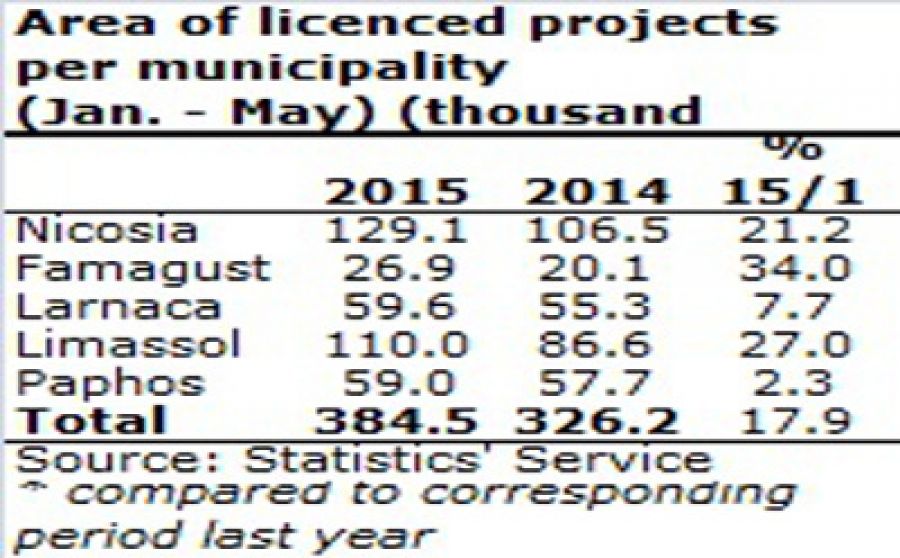 По данным Cystat, площадь под строительные проекты, на которые получены лицензии, за первые пять месяцев 2015 года увеличилась на 17,9% и достигла 384 500 кв. м по сравнению с 326 200 кв. м в аналогичном периоде 2014 года. Наибольший рост был зафиксирован в Фамагусте, где площадь будущего строительства достигла 26 900 кв. м по сравнению с 20 100 кв. м в соответствующем периоде 2014 года, увеличившись на 34%.