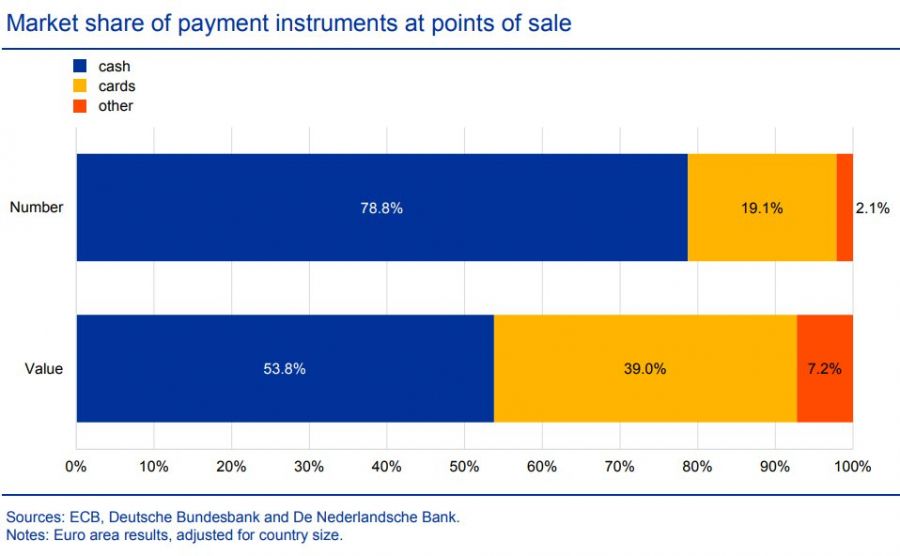 Примерно 79% всех ежедневных денежных расчетов в еврозоне в 2016 году были в наличной валюте. Для Кипра эта цифра даже больше – 88%. Такие данные приводит Европейский Центробанк по итогам соответствующего исследования. Почти четверть европейцев хранит наличные деньги дома «на черный день». Отмечается, что полученные ЕЦБ результаты «ставят под сомнение распространенное мнение о том, что наличные деньги стремительно уступают позиции безналичным расчетам».
