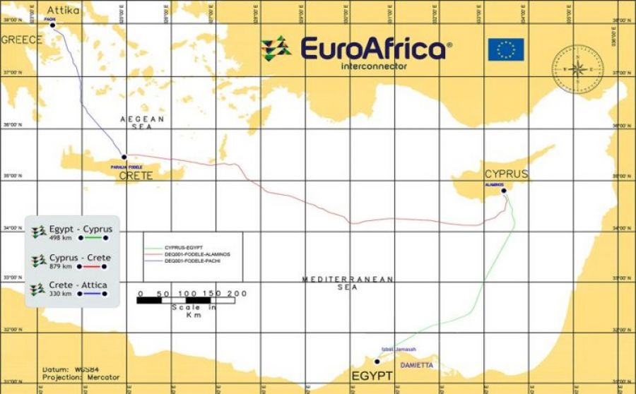 Кипр и Египет согласовали маршрут пролегания подводного силового кабеля EuroAfrica Interconnector протяженностью 1 707 км и пропускной способностью 2 тыс. МВт, который свяжет энергосистемы двух стран с Грецией, а также точки выхода кабеля на берег и место расположения преобразовательной подстанции.
