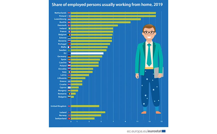 Больше всего работают на дому голландцы и финны. Нидерланды и Финляндия возглавили список стран-членов ЕС по дистанционному труду: в 2019 году 14,1% занятых людей обычно работали из дома. За ними следуют Люксембург и Австрия (11,6% и 9,9% соответственно), где обычно работали из дома. Напротив, самые низкие показатели по удаленке были зарегистрированы в Болгарии (0,5%), Румынии (0,8%), Венгрии (1,2%), на Кипре (1,3%), в Хорватии и Греции (по 1,9%).