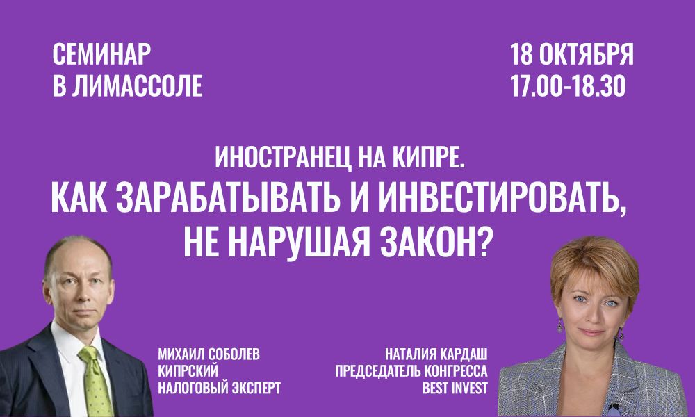 В рамках конгресса Best Invest 18 октября состоится очный семинар на тему «Иностранец на Кипре. Как зарабатывать и инвестировать, не нарушая закон?». Участие для делегатов конгресса бесплатное. Для тех, кто не принимает участие в работе конгресса, стоимость семинара 70 евро (НДС включен).