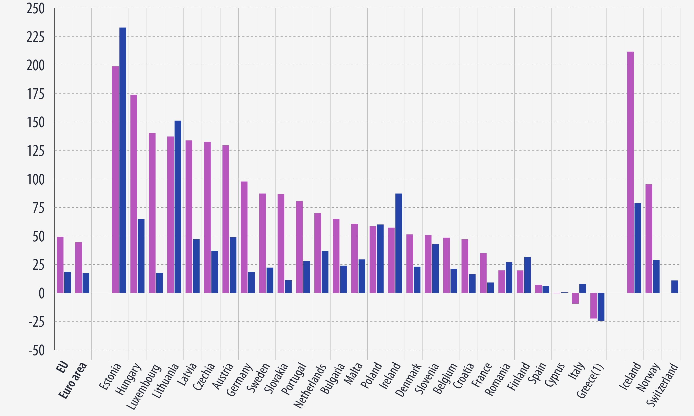 При сравнении арендной платы в третьем квартале 2022 года с 2010 годом цены выросли в 26 государствах ЕС и снизились в одном. Наибольший рост произошел в Эстонии (+233%) и Литве (+151%). Снижение было зафиксировано в Греции (-24%).