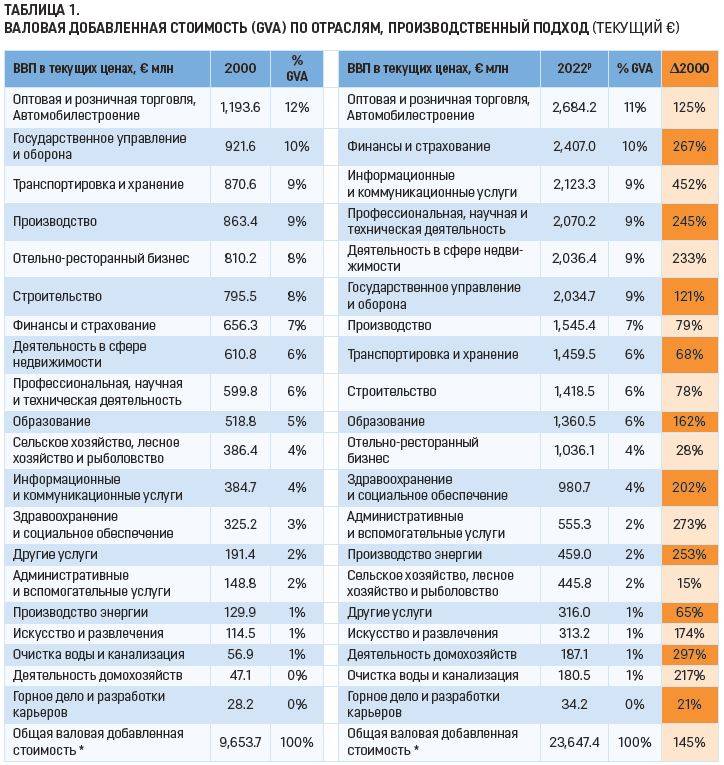 В 2000 году в топ-5 отраслей экономики входили сегменты «реальной экономики»: оптовая и розничная торговля; государственное управление и оборона; транспортировка и хранение; производство; отельно-ресторанный бизнес. Эти пять крупнейших секторов внесли 4,7 млрд евро в валовую добавленную стоимость (GVA), что составляет 48% от общей GVA.