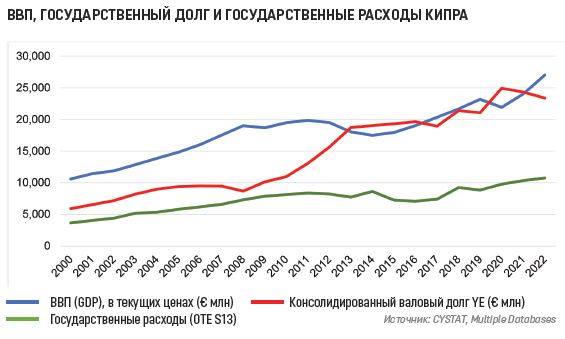 В то же время государственный долг в 2000 году вырос с 5,9 млрд, или 56% ВВП, до 23,4 млрд евро, или 87% ВВП, в 2022 году. Высокая инфляция в 2021-2022 годах выравнивает соотношение долга к ВВП. И, наконец, расходы госсектора Кипра выросли с 3,7 млрд евро в 2000 году, или 34% ВВП, до 10,8 млрд евро в 2022 году, или 40% ВВП.