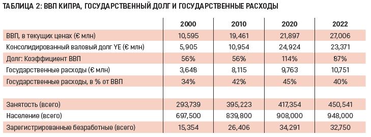 Таблица 1 иллюстрирует огромный прогресс, достигнутый Кипром в период с 2000 по 2022 год. Валовая добавленная стоимость (с использованием производственного подхода к расчету ВВП в текущих евро) выросла с 9,7 млрд евро в 2000 году до 23,7 млрд евро в 2022 году, увеличившись на 145%. (Помните, что текущие показатели ВВП включают инфляцию).