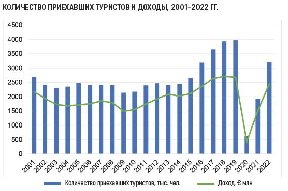Несмотря на то, что общие цифры выросли, доходы на одного туриста остались в основном на прежнем уровне (см. график). В 2001 году на Кипр прибыло 2,7 миллионов туристов, а доход от туризма составил 2,2 млрд евро, или 806 евро на одного туриста. В 2022 году на Кипр прибыло 3,2 миллиона туристов, а доход составил 2,4 млрд евро, или 762 евро на одного туриста.