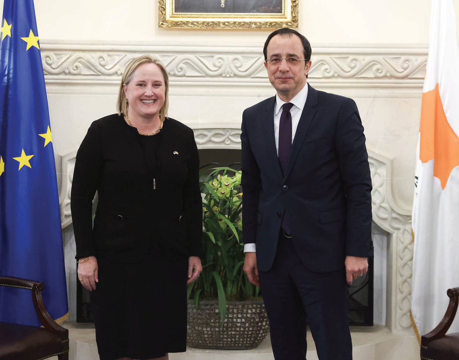 Президент Никос Христодулидис и посол США на Кипре Джули Фишер. Фото PIO