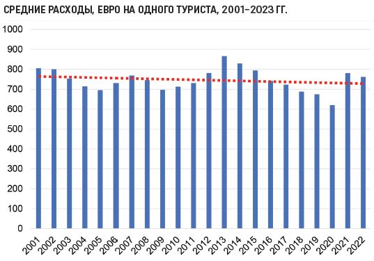 2. Расходы на одного туриста указаны в текущих евро, т.е. с учетом инфляции. Если сделать разумное предположение и исключить предполагаемую инфляцию в 3% в год (что определенно является заниженной оценкой), то реальные расходы на одного туриста с учетом поправки на инфляцию снизились гораздо сильнее.