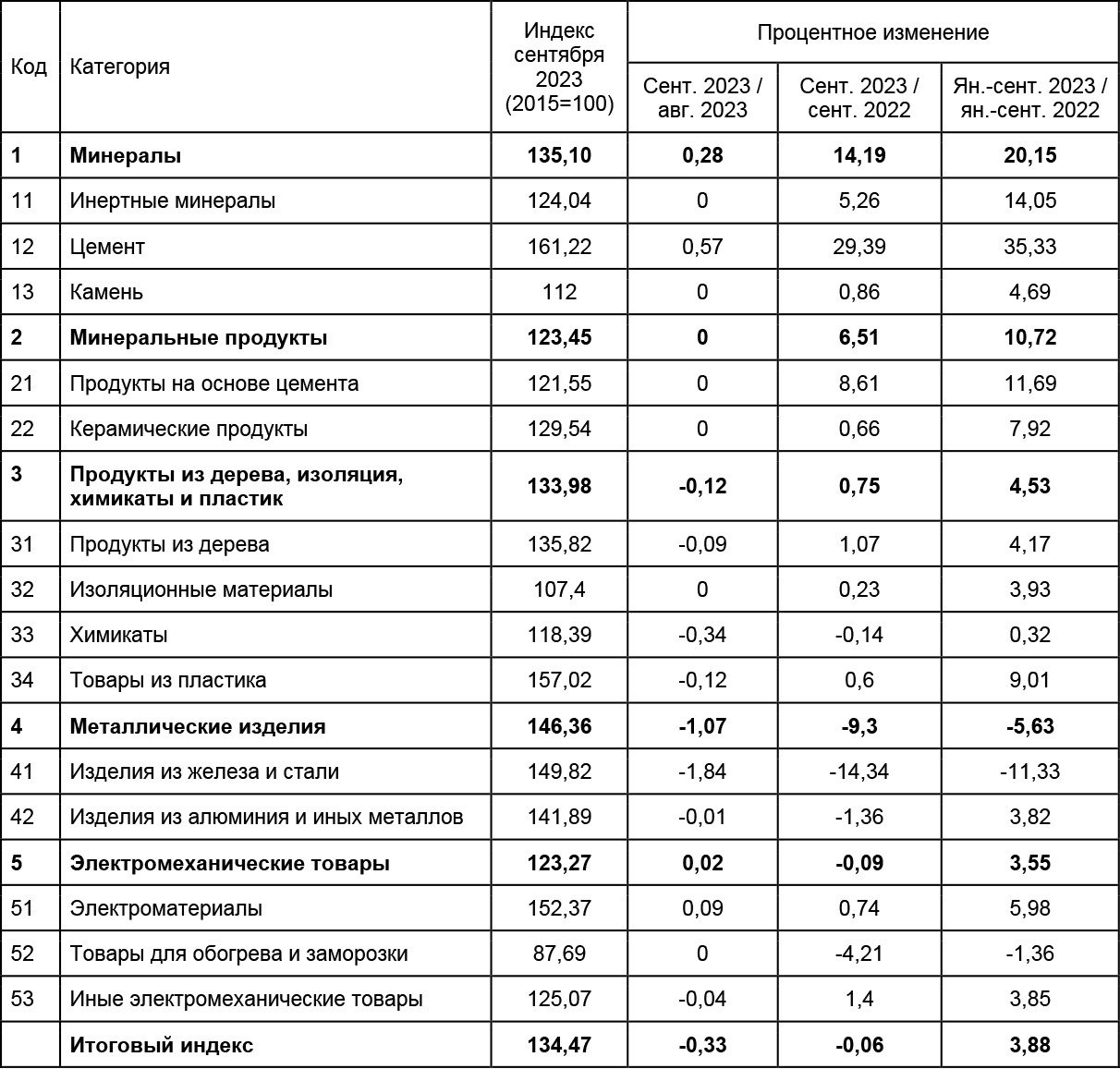 Согласно данным Статистической службы, индекс цен на строительные материалы в сентябре 2023 года составил 134,47 единиц (за 100 приняты показатели 2015 года). Это на 0,33% ниже, чем в августе 2023 года, и на 0,06% ниже, чем в сентябре 2022 года.