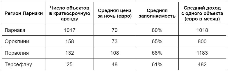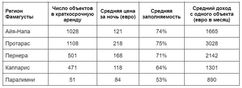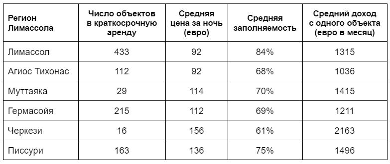 Почти 3200 объектов расположены в свободной части региона Фамагуста, подавляющее большинство из них ― в Протарасе и Айя-Напе. В регионе Лимассола расположено около 1000 объектов недвижимости в краткосрочную аренду, средняя цена аренды тут составляет 92 евро в сутки.