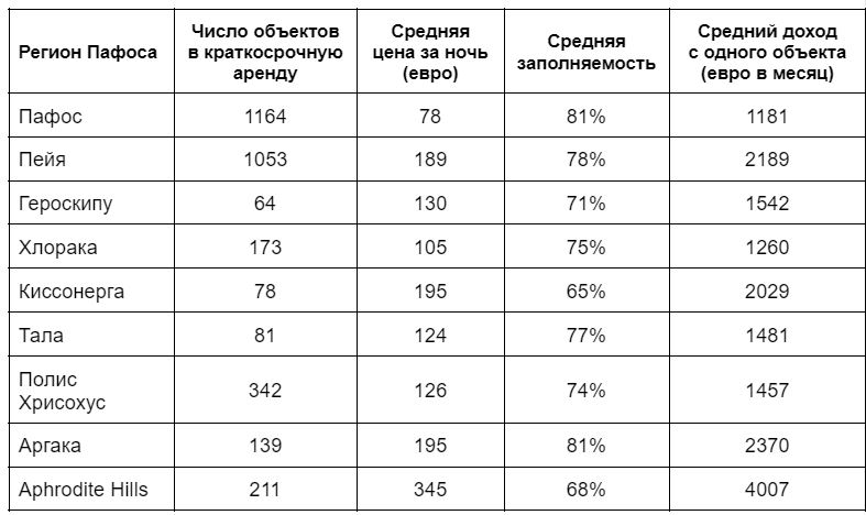 Как и в гостиничном бизнесе, наибольшее количество объектов краткосрочной аренды расположены в Пафосе и на свободных территориях Фамагусты. Именно в регионе Пафоса расположено большинство объектов недвижимости, представленных на онлайн-платформах AirBnB и Vrbo ― более 3300. Треть из них находится в городе Пафос, где средняя цена бронирования составляет 78 евро за ночь, а среднемесячный доход с одного объекта оценивается в 1181 евро.