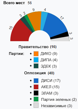 В составе Парламента нынешнего созыва 17 депутатов от партии ДИСИ, 15 – от АКЕЛ, 9 – от ДИКО. Это три основные партии страны, от решений которых зависят практически любые выборы. Кроме того, есть несколько других партий меньшего размера: ДИПА (4 депутата), ЭДЕК (3), Элам (3), Партия зеленых (2), 3 человека прошли в Парламент, как независимые депутаты. Итого 56 депутатов.