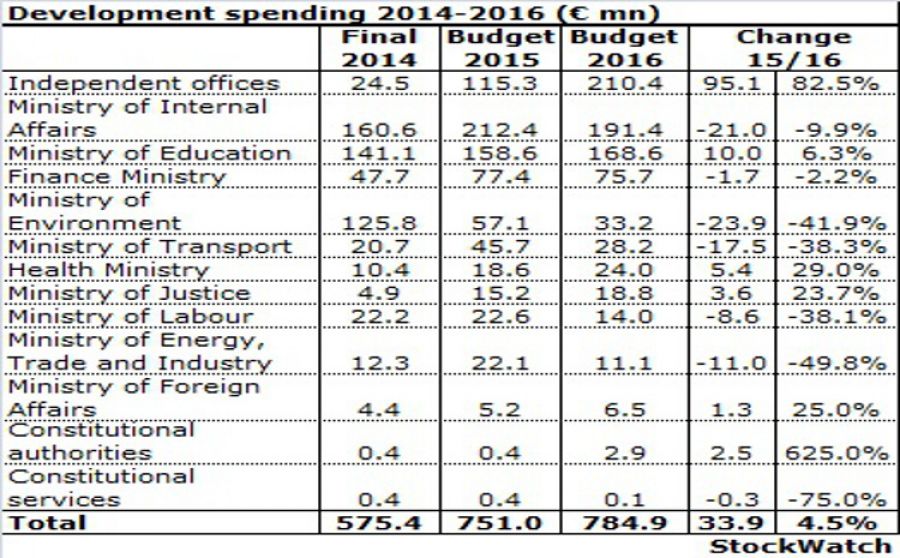 Наибольшее уменьшение расходов на развитие ожидается в министерстве сельского хозяйства, где бюджет снижен на 23,9 млн евро до 33,2 млн евро. Статья расходов министерства внутренних дел уменьшится на 21 млн евро, а министерства коммуникаций и общественных работ – на 17,5 млн евро. Значительное снижение расходов на развитие в 2016 году запланировано также в бюджетах министерства труда и министерства финансов.