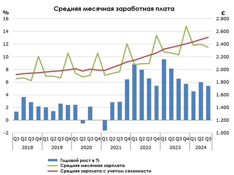 Согласно последнему отчету Статистической службы Кипра по состоянию на третий квартал 2024 года, средняя заработная плата на Кипре составляет 2351 евро. В третьем квартале 2023 года средняя зарплата была на уровне 2230 евро в месяц, за год показатель увеличился на 5,4%. С учетом сезонности в третьем квартале 2024 года средняя заработная плата равна 2506 евро в месяц.