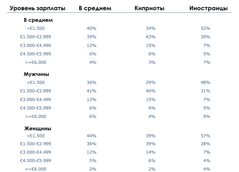 Ниже приводится статистика заработной платы в процентном соотношении, есть различия между киприотами и иностранцами, а также между мужчинами и женщинами.