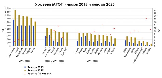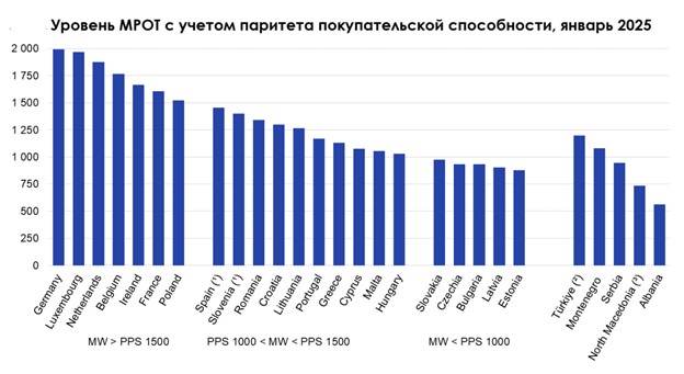 Далее приводятся данные по странам, разделенным на три категории: МРОТ более 1500 евро в месяц, МРОТ от 1000 до 1500 евро и МРОТ менее 1000 евро.