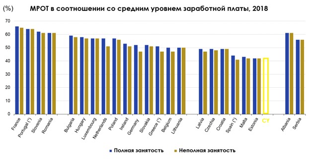 Также страны отличаются в том, сколько процентов составляет МРОТ от средней месячной зарплаты населения – эта доля варьируется от 42% до 66%, на Кипре МРОТ равен 42,5% средней заработной платы. На графике представлено процентное соотношение МРОТ к средней заработной плате по странам ЕС за 2018 год, Кипр находится на уровне Испании, Мальты и Эстонии.