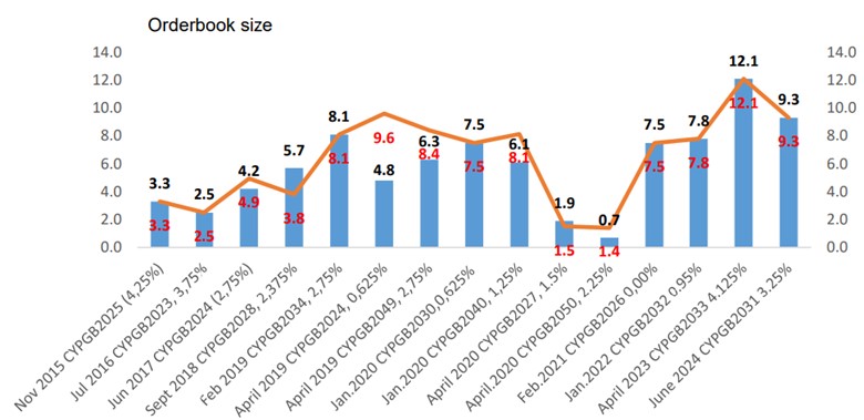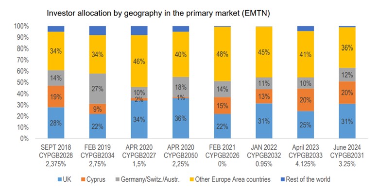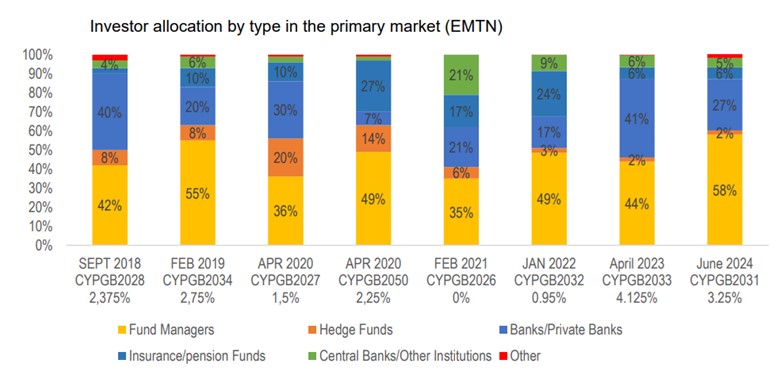 На момент последнего выпуска кипрских EMTN (июнь 2024 года) большинство инвесторов кипрского государства составляли инвестиционные фонды (58%) и банки (27%), за ними следуют страховые и пенсионные фонды (6%) а также центральные банки, госучреждения и госорганизации (5%).