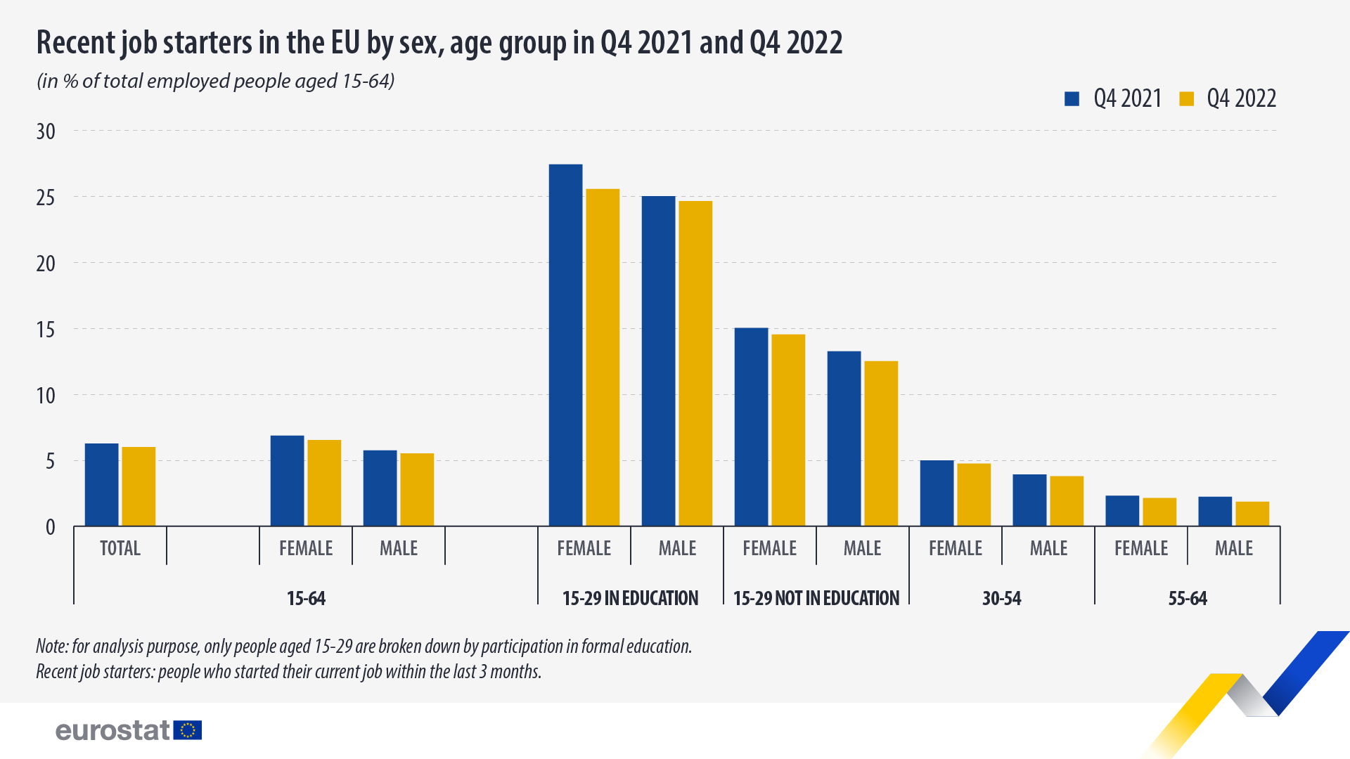 Среди женщин, приступивших к работе в течение трех месяцев, наблюдался больший спад (с 6,8% в 4-м квартале 2021 года до 6,5% в 4-м квартале 2022 года), чем у их коллег-мужчин (с 5,7% до 5,5%).