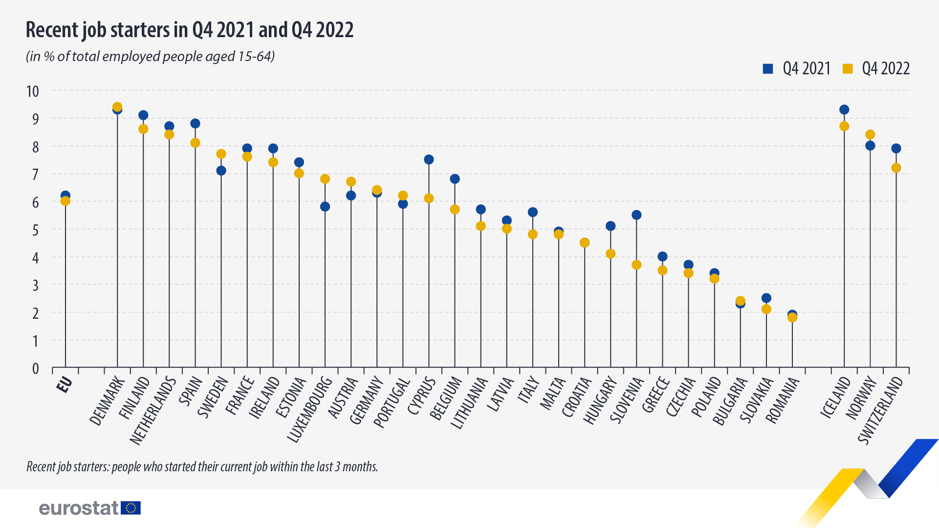 В 4-м квартале 2022 года самый высокий процент сотрудников, недавно начавших работу был зафиксирован в Дании (9,4% от общего числа занятых на рынке труда), а также в Финляндии (8,6%) и Нидерландах (8,4%). Самые низкие показатели были отмечены в Румынии (1,8%), Словакии (2,1%) и Болгарии (2,4%).