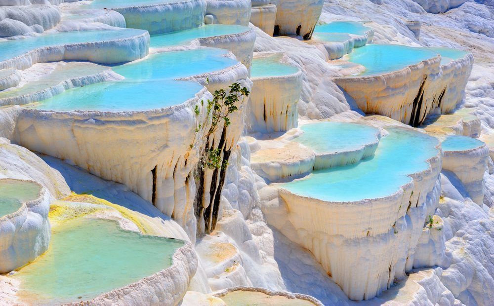 Это удивительное природное образование, название которого в переводе с турецкого означает «хлопковый замок». Термальные источники в провинции Денизли на юго-западе Турции на протяжении столетий формировали каскад террасных ванн, украшенных белоснежными кальцитовыми сталактитами. Эти террасы создают впечатляющий вид, напоминающий ступени гигантского замка.