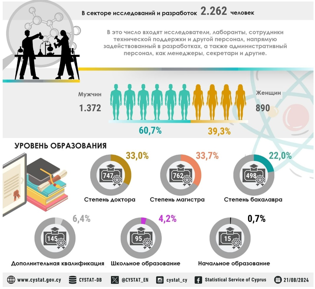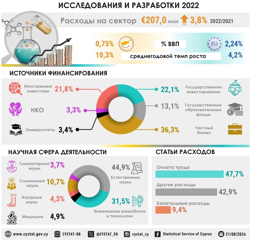 Статистическая служба Кипра опубликовала данные по сектору исследований и разработок за 2022 год. Цифры проиллюстрированы инфографикой, которую «Вестник Кипра» перевел на русский.