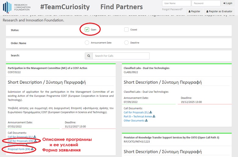Дополнительная информация о программах и подаче заявлений доступна на сайте RIF IRIS – https://www.research.org.cy/en/. Необходимо зайти в «Открытые программы» (Open Calls). В списке документов каждой программы есть описание условий (Calls for proposals), список дополнительных документов и форма заявления (Proposal form).
