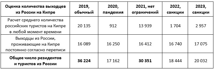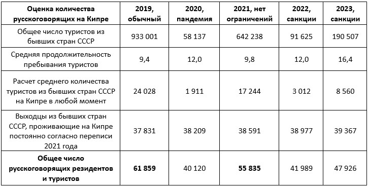 По переписи 2021 года, на Кипре проживали около 38,5 тысяч человек, родившихся в странах бывшего СССР. Если добавить среднее число туристов из этих стран, то получаем почти 56 тысяч человек. Максимальный показатель все также приходится на 2019 год – около 62 тысяч человек. Казалось бы, вот и есть те самые «50 тысяч»?