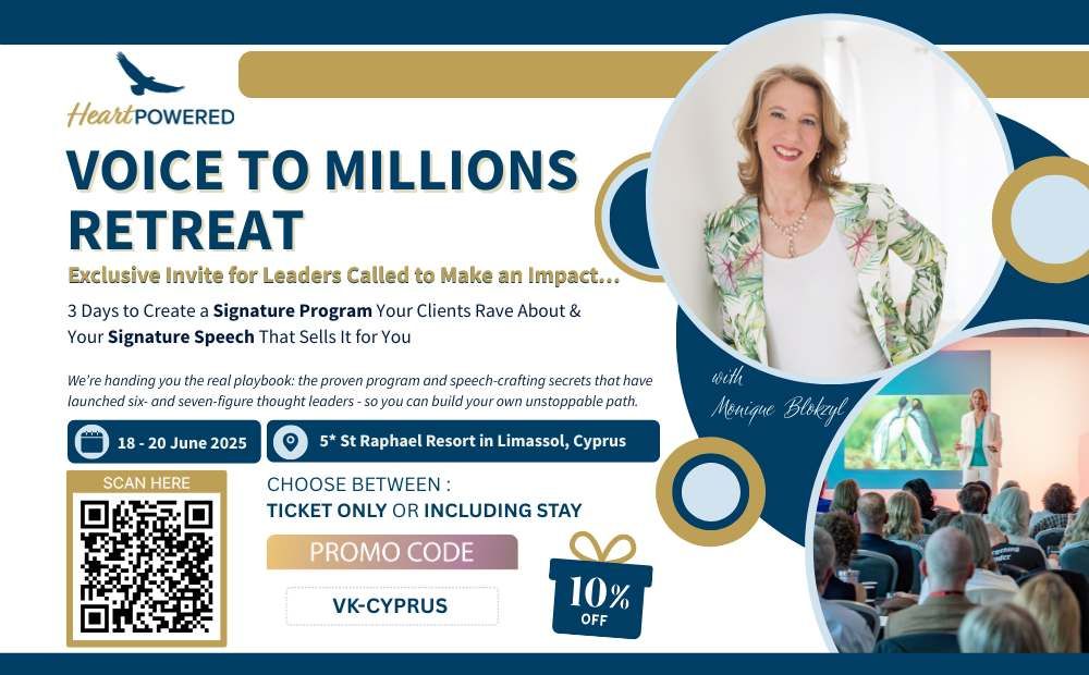 В Лимассоле 18-20 июня состоится ретрит Voice to Millions, организованный компанией Heart Powered Business, где бизнес-лидеры за 3 дня смогут создать авторскую программу для своих клиентов и научатся писать фирменную речь, которая будет способствовать продажам.